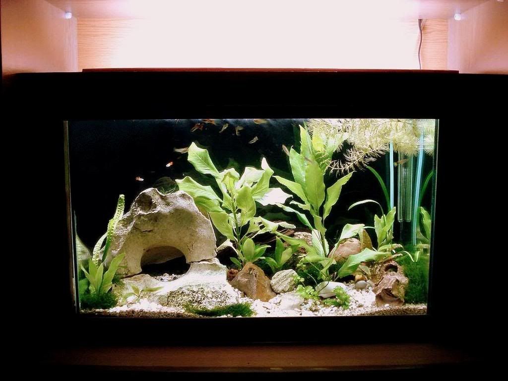 не съм чел темата, но си мисля че лимончетата са твърде едролистни за твоя аквариум, иначе с толкова мног окамъни , гъста растителност на туфи и мъхове предполагам ще стоят добре  :-)