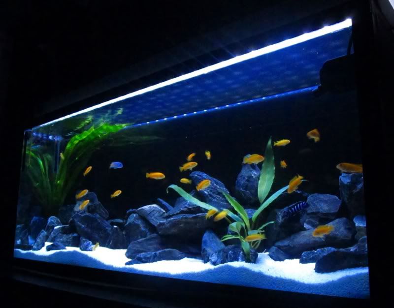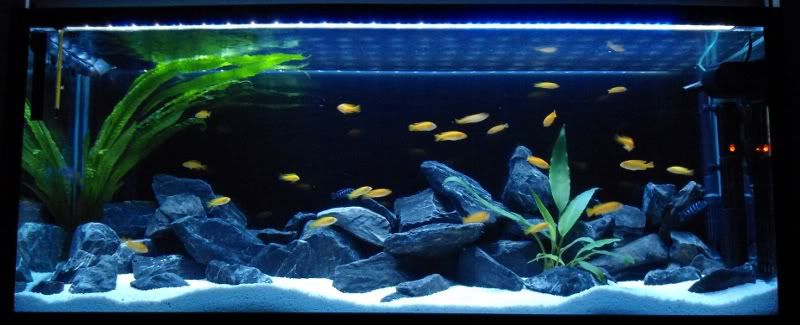 Страхотен  е аквариума. И по размери нестандартен. Аз замислям нещо от рода на 130/30/55 и ме интересува като наредиш камъните остава ли място много за рибетата. По снимките ми изглежда добре. Сподели малко и за осветлението-страхотно изпъкват цветовете на цихлидите. *THUMBS UP*