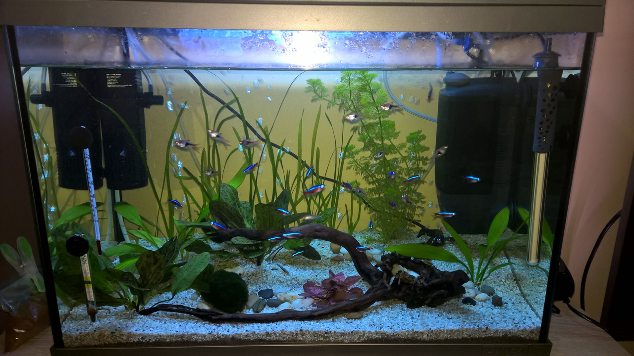 Риби: 20 неони, 10 разбори, 2 анцитруса, 3 коридораса панда и едно САЕ