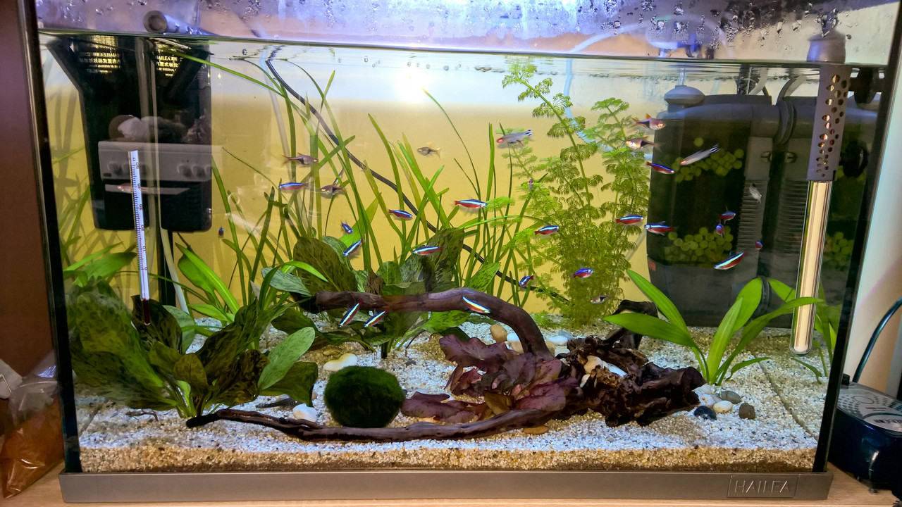 Аквариума ти още е нов не го осветявай повече от 8ч. на ден.тетра Complete substrat ако си сложил 5кг. е много а растенията са ти малко.Сложи още растения за да консумират този хранителен грунд иначе ,може да имаш проблеми с водорасли.Рибките също не са малко ,недей да слагаш повече.Допълни си аквариума с вода на 1-2 см от ръба.За осветлението си купи механичен или електронен таймер,за да имаш еднакава продължителност на светоденя,защото ако един ден светиш 8ч.,а на другия 12ч. не е добре,ще имаш проблеми с поява на водорасли.Единия термометър е излишен.Като се ралисти ще стане хубав.