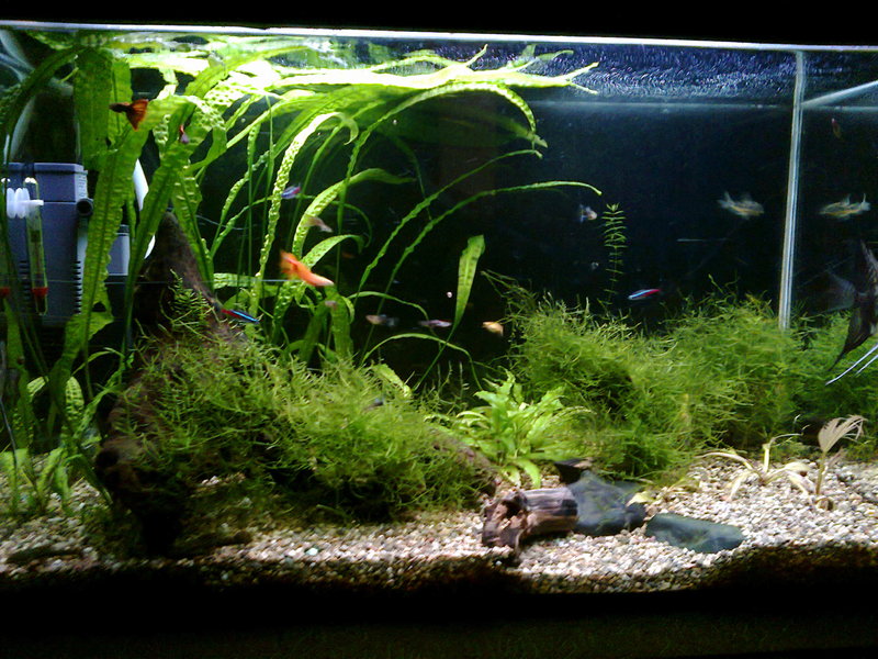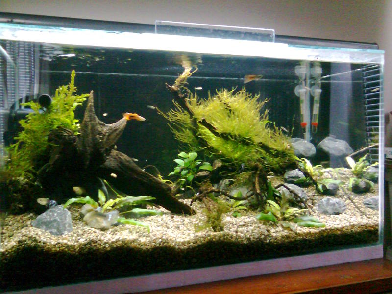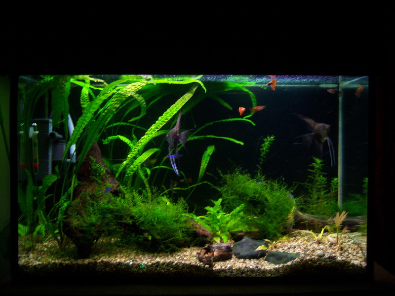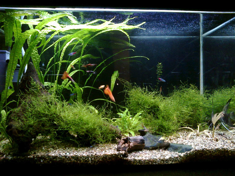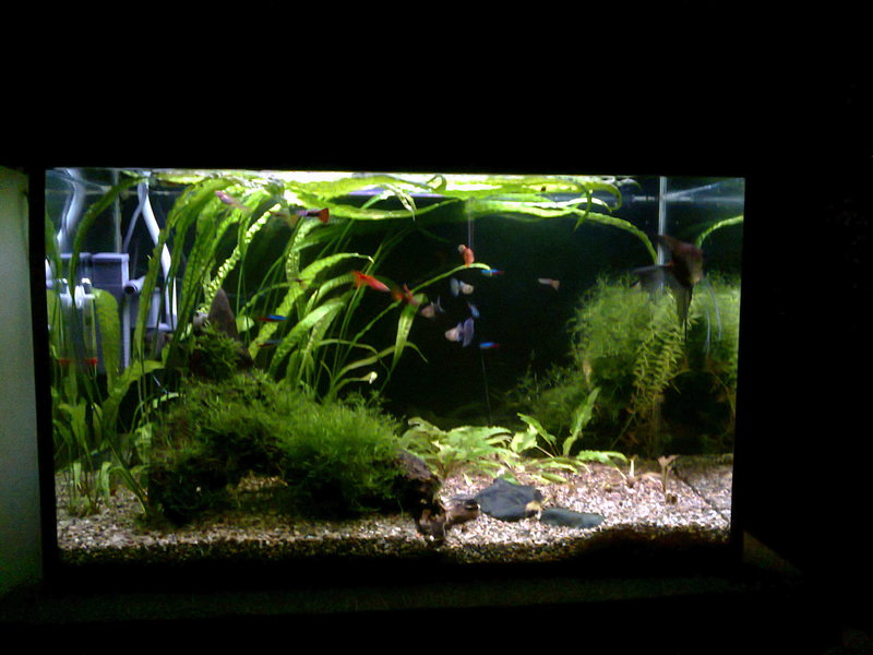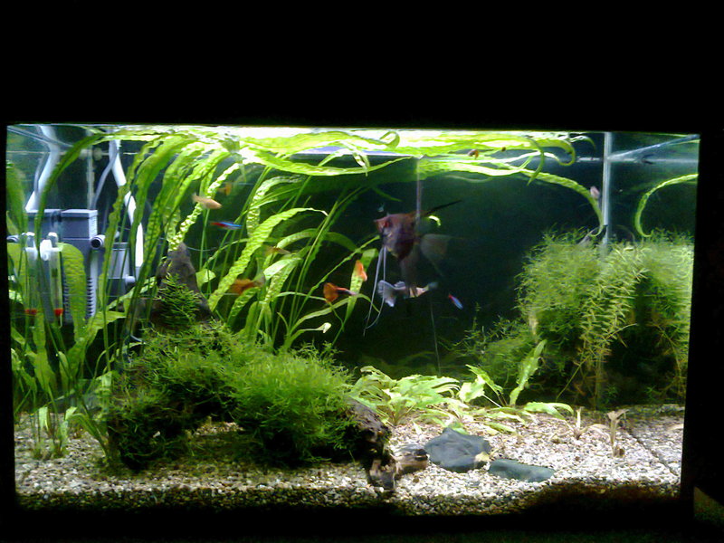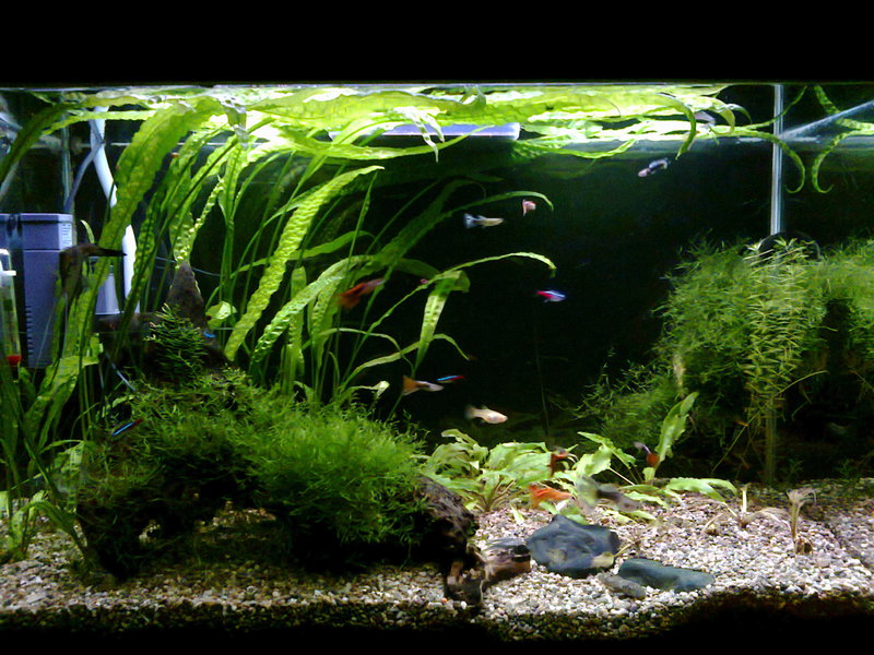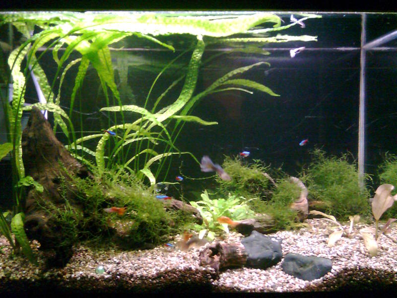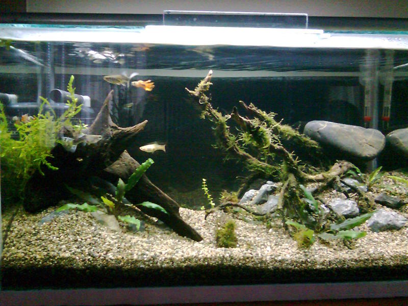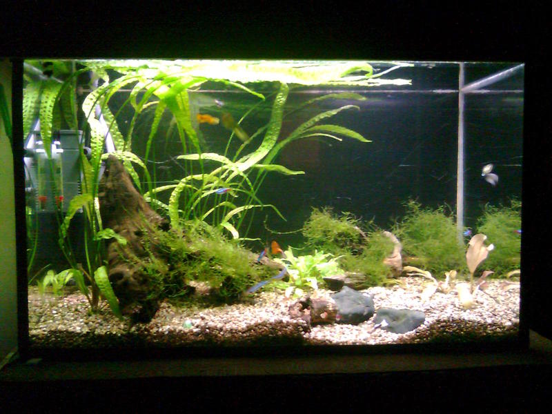 Здравейте,след доста четене из този форум,реших да се регистрирам и да си покажа аквариума.Размера му е следния 75/43/35 д/в/ш 100л. Филтрция два вътрешни филтъра Sark 600 и 300 лч,като водата от големия минава и през един самоделен капещ филтър.Осветление 2х18w.Грунд речен пясък 3-5мм.Растения криптокорини,явански мъх и един местен вид.