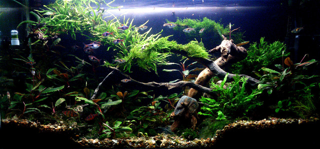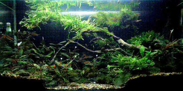 Малко да се избистри и утаи мътоляка и ще има продължение, по принцип нещо такова ми е идеята- не истински биотоп,но поне визуално малко да заприлича на джунглата на Борнео под вода,виждал съм убийсвени снимки на реки с растителност в тях и отстрани.Със сигурност няма да е биотоп,имам растения,които не са от там,но не ми се махат,обаче прават джунгли.