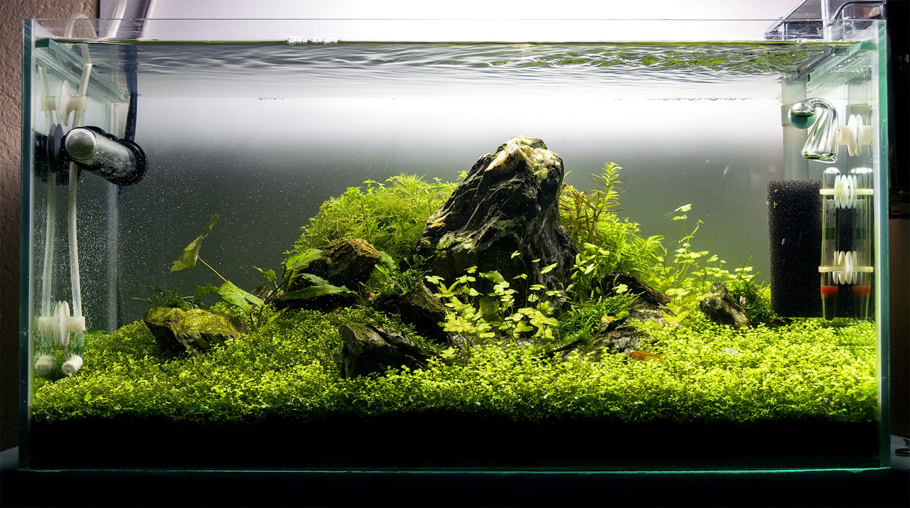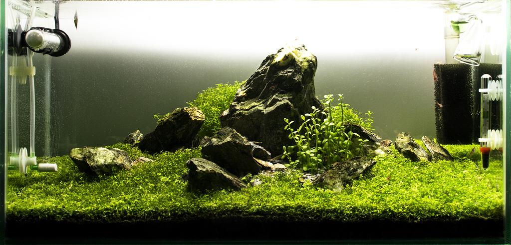 Аз определено не съм фен на акваскейпа, все едно да харесваш изрусена мургавелка със силиконови цици и устни, но ако се придържаш към него трябва да махнеш излишната растителност и подчертаеш камъните. На предишната страница имаш определено красив акваскейп, който се е обременил с развитието на растенията. Ако сложиш още един камък, който да скрие устройствата, ще е перфектно.