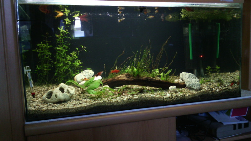 Новият ми аквариум. Даваите идеи какво може да се направи че ми се вижда постен нещо. Размери - 95д/50в/40ш Обем-190л.