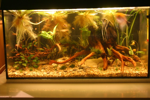 Малко развитие с големия аквариум, почти 20 дена след старта. Добавах Eleocharis sp. mini, папрати, явански мъх. Плаващите растения ще бъдат махнати в последствие, идеята беше да помогнат в стабилизирането на аквата като за начало. Следващата ми цел е да сложа енергоспестяващи крушки ( 4000К ) и още папрати.