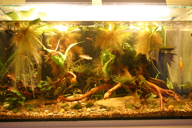Малко развитие с големия аквариум, почти 20 дена след старта. Добавах Eleocharis sp. mini, папрати, явански мъх. Плаващите растения ще бъдат махнати в последствие, идеята беше да помогнат в стабилизирането на аквата като за начало. Следващата ми цел е да сложа енергоспестяващи крушки ( 4000К ) и още папрати.