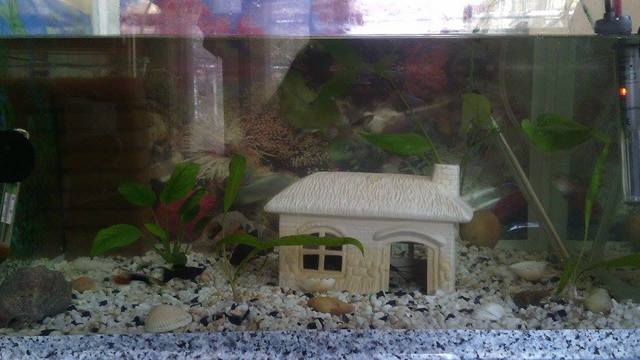 И аз гласувам да махнеш къщата и мидите, фона също може да го смениш, на него са соленоводни обитатели, а пък твоя аквариум е със сладка вода ;)
