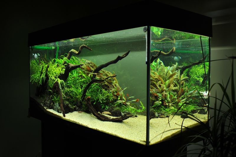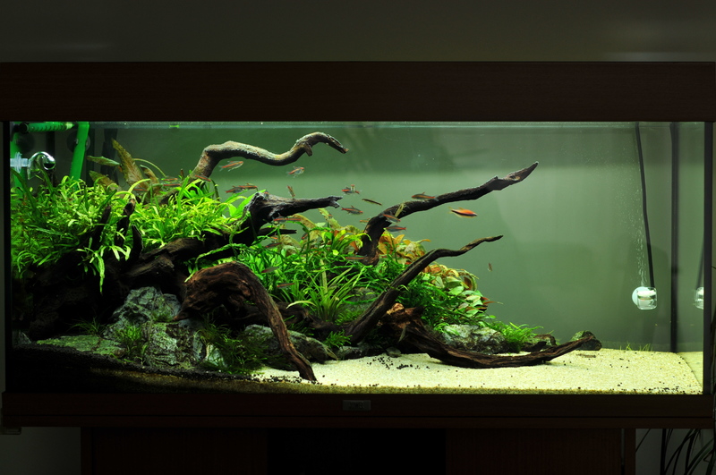 Много хубав аквариум.Корена,камъните и зелената маса са подредени много добре.Ако в празния край се сложат няколко малки камъчета от същия вид на купчинка и между самите тях се боднат 1-2 анубиаса нана петит (тия малките май така се казваха)и да стигат почти до най близката част на корена няма ли да стане добре?Само питам,да не ме ''нахраните''сега. *privet*  *bg*