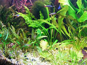 Аквариума има следните размери  80/45/70/ Съответно Д/В/Ш. Ползувам старата вода от предния аквариум 1/2 + нова  .CO2 мая +захар.Осветление 3 ХТ4 на 20 вата едната е малко по дълга и е 22 вата. 2ХТ4 на 9 вата. 2 Х18 вата. Предстои ми да добавя още една Т4 и 2 броя на 18 вата.  Една вътрешна помпа на SUN SUN 1200 Lt/h  и една на 240 Лт/h .  Не съм още започнал да торя. Нека се съвземе аквариумчето.