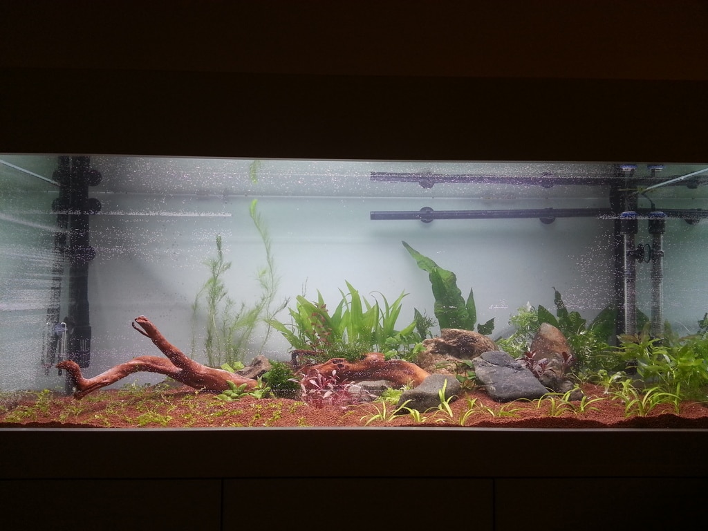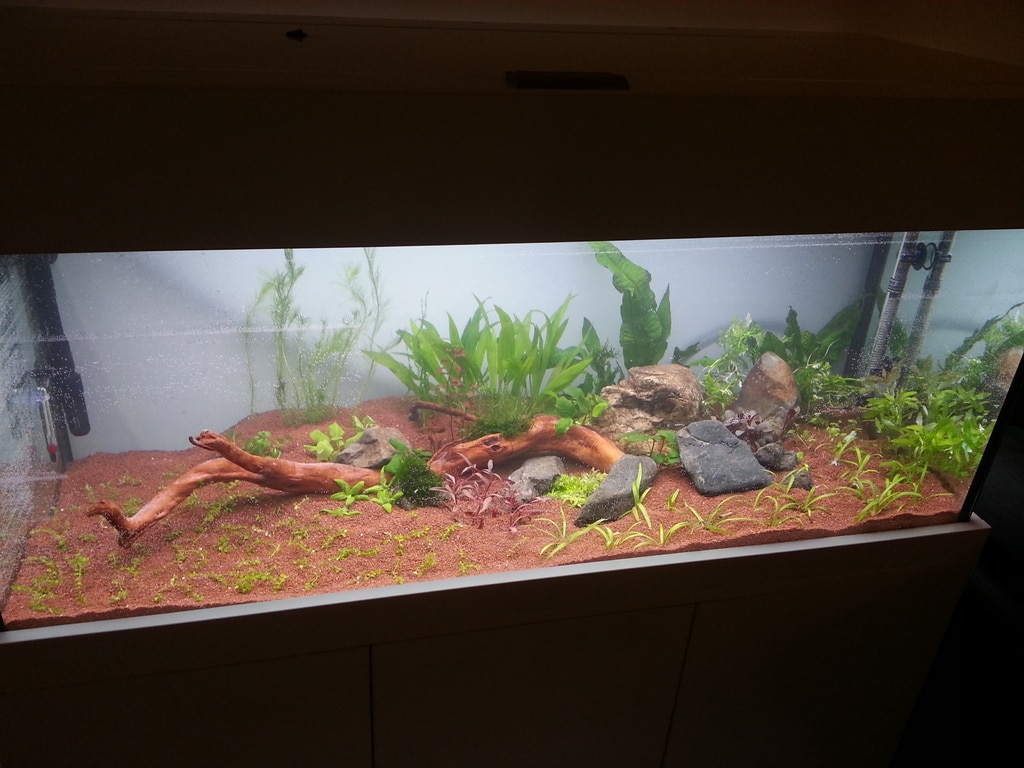 Целта ми беше да има възможно най-много растения при старт, някои са по-бързорастящи, други не толкова, но все пак премахнах всички много взискателни растения от плана. Преди засаждането почистих много хубаво всички растения и мисля, че не съм внесъл нищо в аквариума, поне засега, няма признаци на епидемия от каквото и да било. Клюмнали и тъжни растения няма, всички се изправиха много бързо след старта, някои като Ludwigia-та вече дори започнаха да растат нови листа. При старта стрих малко храна за рибки за стартиране на цикъла. Самото стартиране ми отне цяла нощ и вчера не съм спал, но изобщо не съм усетил кога са отлетели 9 часа. :D