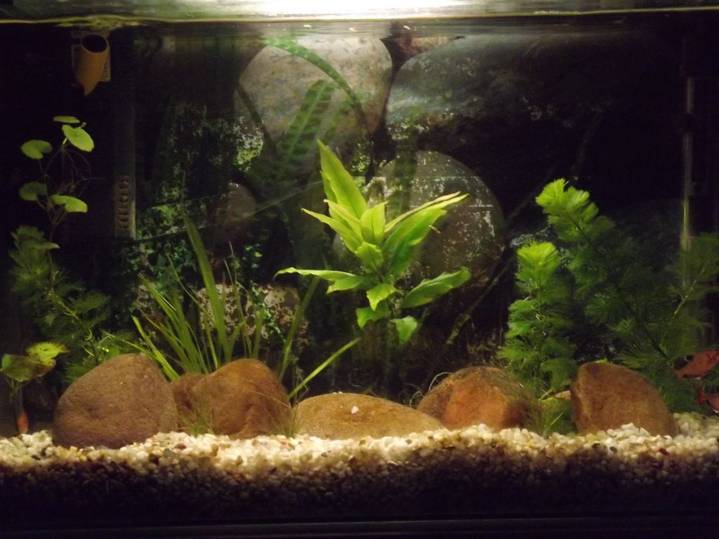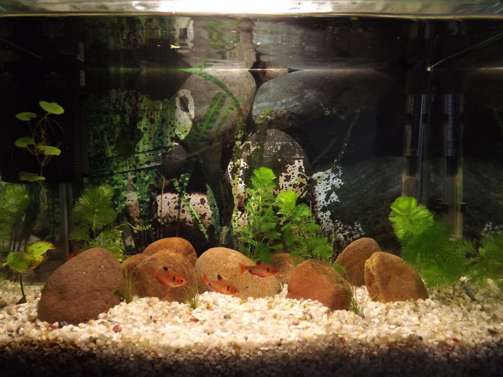 Кабомбата е добро растение за стартиране на аквариум.Когато го стабилизираш може да преминеш към по бавнорастящи и капризни видове,стига да си старателен към осветление и параметри на водата.Купи още няколко серпи,че са егати агресивните риби,може да им пуснеш скалария,ако са гладни или друга риба с воални перки(това в кръга на шегата).Вместо камъни по-добре намери един хубав корен,който да предлага укрития и тези тетри обичат хубаво залесени аквариуми ,акваримът ти е малко малък за тези риби,пасажа обича да се движи в едно 100-130 литра поне така,че храни рибата и внимавай за вретеновидна агресия.За това повече укрития и още няколко риби.