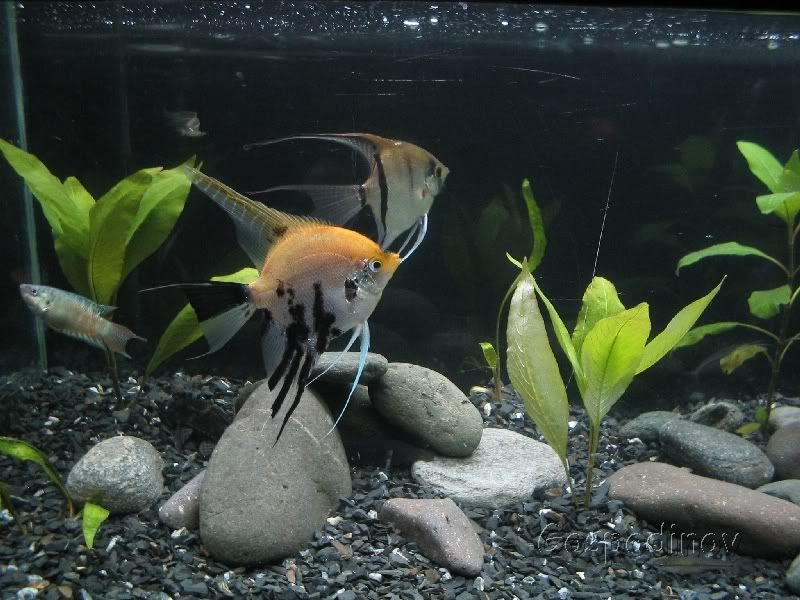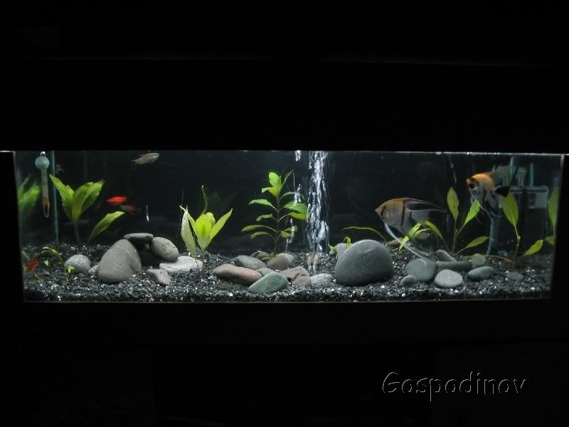 Абе не знам правилна ли ти е посоката, но е странна. Много странен избор на грунт. Това някаква черна мозайка ли е? Не мисля че е много добра за целта. Иначе изглежда по някакъв начин ефектно и ме кефи как си разхвърлял камъните, но едва ли ще получиш висока оценка от хора които се занимават сериозно с това хоби. Растенията са ти малко. А и много странен подбор на риби. Най-малкото на тия скаларии 30 см им е малко като дълбочина. Е и моите са на 40, което не е много повече, но тва си е мой проблем.