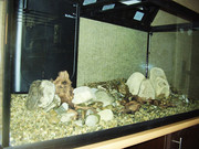 Аквариумът  е 110х45х58.5, вътрешен филтър и нагревател (дойде си в комплект), осветление 2х39 W (пада се по около 0.39 на литър), грунд -  речен пясък купен от кариера, два корена мопани, речни камъни.