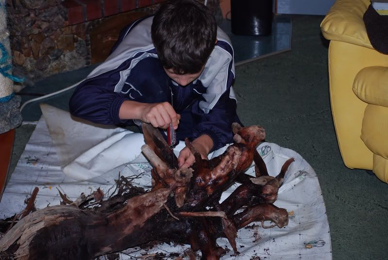 Тук отново дойде ред да се намеси лудия. На следващия ден той взе обработената находка и отиде във фирмата на един негов познат, дето навремето му помогна в направата на шкаф за аквариума. А, както знаете, краставите магарета през девет баира се намират, че и сега неговият приятел не му отказа. Двамата извадиха долната част от един 200 литров казан за варене на ракия и го цопнаха над огъня. Само, че не ставаше въпрос за варене на ракия, а за бульон от корен на червена върба. И за да не стане много червен бульона, лудия сипа половин пакетче калиев перманганат, което направи супата почти черна на цвят тъкмо по вкуса на лудия. То пък един вкус!?!?
