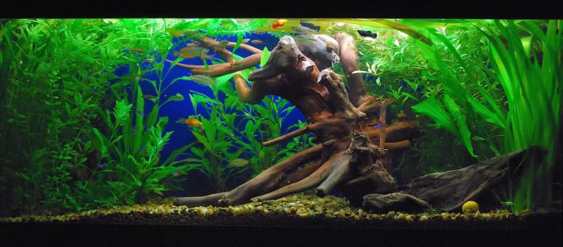Аквариума е супер,браво!Като гледам не е кладофора ми са си зелени нишковидни,наистина трудно се махат,при мен конхониусите помогнаха.Фона наистина щеше да е по-добре да е по тъмен или черен,но и така не е лошо.До колкото си спомням е боя и няма опция за смяна.