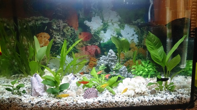 Един колега също доста четящ каза, че мидите и коралите нямат място в сладководен аквариум.. Ама ето на оказа се, че имало. Сестра ми се радва и семейството също. Аз се радвам и до няколко дни ще плуват вече сини и червени гупи. Жълтите молинезий ще ги подаря на едно детенце от училището на сестра ми. Може и даньото да махна.