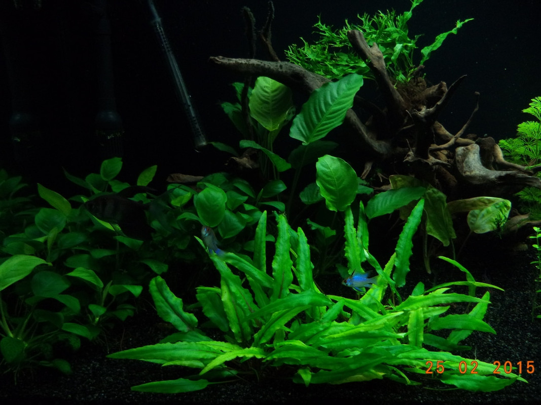 Растения: доста са предимно Анубиас, Криптокорини, Микрозрум, мъхове, няколко бързо растящи...