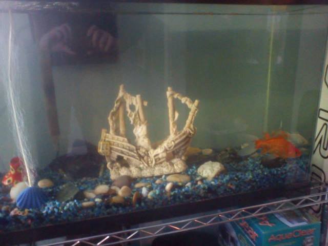 Това е малко гадна снимка на 115 литровия на работа- правена с телефон и малко гадна светлина и преди да изчистя водата хаха. Но както и да е има 3 златни рибки в него и филтрацията е както казах е двойна. Махнах всичко от аквариума за да имат пространство да плуват и да се ровичкат в грунда :)