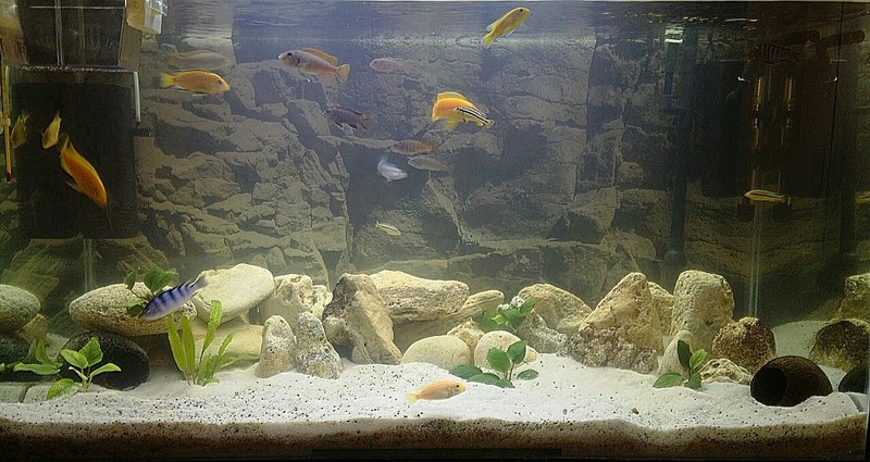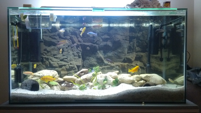 Поздравления за аквариума,но декорацията ти е ужасно,казвам ти го не да се заяждам,а за да те стимулирам да си вземеш малко по-големи камъни и да ги наредиш като хората :).Успех.