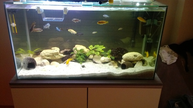 Поздравления за аквариума,но декорацията ти е ужасно,казвам ти го не да се заяждам,а за да те стимулирам да си вземеш малко по-големи камъни и да ги наредиш като хората :).Успех.
