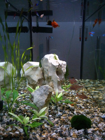 Осветлението ти идва слабо по-принцип, но не го пипай за сега. Увеличиш ли го, ще те подгонят водорасли. А и анубиса по се радва като му е сенчесто. Не виждам да имаш таймер на лампите. Ако нямаш купи си механичен (6-7 лв), да вкл. и изкл. по едно и също време. Препоръчвам ти светлоден от 6 ч за начало, а после постепенно през седмица до 8 ч. Иска си доста четене, поддържането на растения. Известно време ще те радват, но ще почнат да се скапват, ако не слагаш микро и макро торове. От там, и подаване на СО2 => пак търсачката и пак четене.