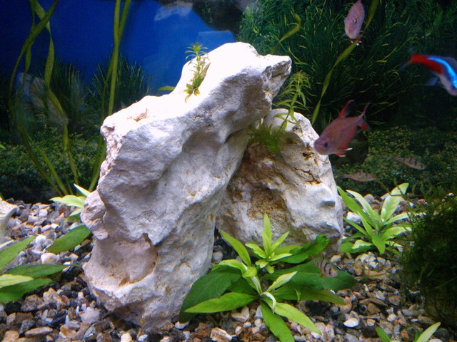 Първо плаката има две страни тази дето е сега и черна страна,за грунда мисля да го сменя с бял кварцов пясък 3-5мм.Казвате че може да сложа още китки,но не знам какви затова дайте съвет,и камъните те са едни и същи казаха ми че са от цихлидник,но и аз не съм сигурен дали не са ме излагали!По-опитните дето познават варовикови  камъни да кажат моите какви са!Благодаря предварително!   8-)