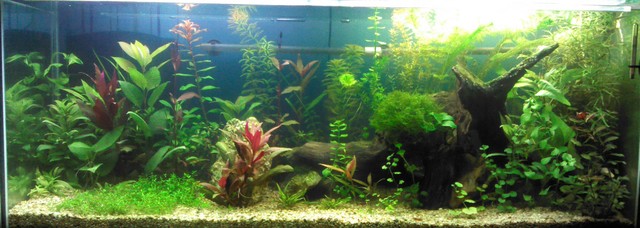 Нищо не разбирам от декорация.Сега целта ми е да покрия целият грунд с полянката.Май това не е най-удачното растение защото искка много косене но пък ми харесва.А другите периодично подменям с бавнорастящи и по широколистни.Растът перфектно и видимо нямат липси.На вторият час от светенето всичко кипва.