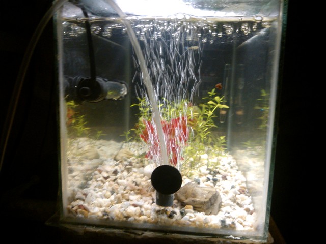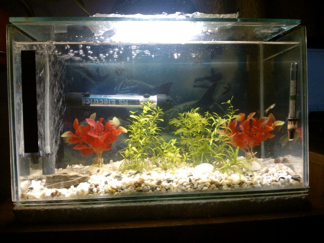 Първо искам да попитам защо нагревателя е така сложен, направи "вади очите", защо не го изправиш и скриеш  в ъгъла да не се вижда. Второ ще ти трябва филтър, с това камъче вкарваш кислород, но нямаш никаква филтрация, има малки вътрешни филтърчета на цена от 10-12 лева идеални за твоя обем аквариум. Трето препоръчвам ти да махнеш изкуствените растения и да сложиш още някое естествено, грунда е едричък, може би някой с фракция 3-5мм ще е по-добре и защо не помислиш за едноцветен фон отзад. Иначе поздравления, че си се постарала да научиш имената на растенията и че не си направила грешката да пренаселиш аквариума, може би ще е хубаво да добавиш някое сомче примерно 3-4 коридораса, или 1-2 анциструса.