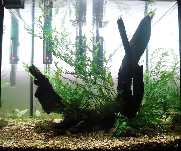Но не съм доволен или по-точно очаквах болбитиса ми да не расте чак с толкова дълги листа и така поставан на клоните съвсем скоро в средната част на аквариума ще се образува як шубрак - в което няма нищо лошо, но визуално няма да стои добре тази тежест,  която ще висне в/у клоните. По този начин, понеже аквариума е малък, както и основата - клоните, ще се вижда едно голямо недоразумение - несъразмерен аквариум.