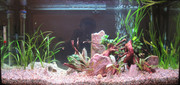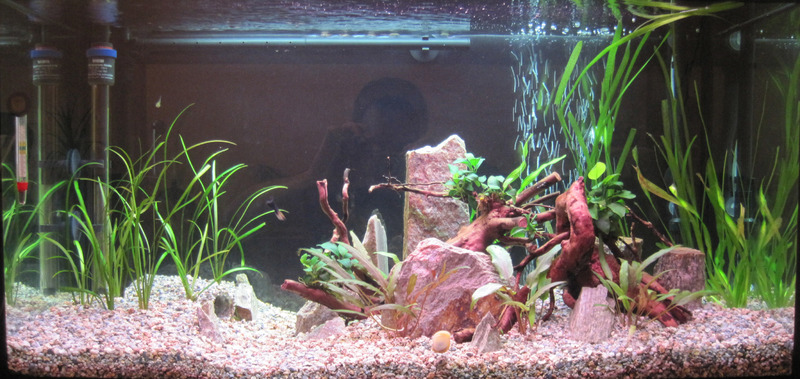 Криптокориние са едни от най-красивите растения, според мен и лесни за отглеждане. Тези камъни най-добре ги махни - нямат место в аквариума. Сложи някаква папрат - на три, четири места в/у клоните. Като дръпне папрата, криптокорината - аквариума ще стане много красив. Имай предвид, че Валиснерията и криптокорината не виреят лесно в един аквариум, не се знае кое от тях ще надделее. Но няма нищо сигурно, може при теб да си се "разбират".