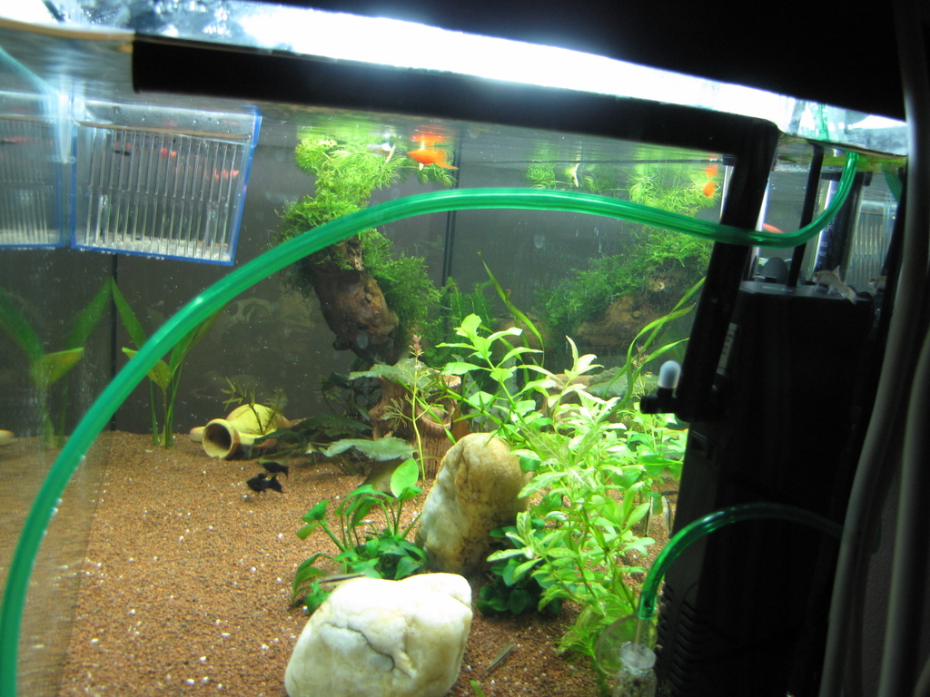 @Julliano, имам предвид, че когато е там под флейтата първо от това малкото изводче разбива балоните преди да са стигнали до повърхността и в допълнение с флейтата балончетата се пръскат из целият аквариум. Преди това пробвах други варианти, но в общи линии тогава балончетата се локализираха само в единият край на аквариума и не можеха да стигнат до другият. Така както е в момента ми се струва най-оптимално, понеже ги пръска из целият аквариум.