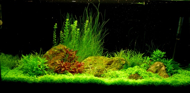 И така... 9 месеца по-късно нещата стоят коренно различно.   *JOKINGLY* Аквариума претърпя малък катарзис - нередовно торене, "леки" прекъсвания на въглерода, силно замърсен филтър, нередовно торене, преместване на аквариума в необитаема стая и ред други обстоятелства. В край сметка резултат е видим по-долу  :-[ . Дори бях пред дилема дали да не прекъсна за малко.... И ето, че сега намерих нови сили  :-) Смятам за начало да вкарам малко нови бързо растящи растения. Да започна да торя малко по-прецизно и да правя по редовни смени на водата, пък ще видим..