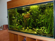Единия е 290 литра а другия 20 литров. Големия е с два металохалогена по 75вата и две пури по 25 мисля. Но смятам да засиля металохалогените на 2 по 150 вата понеже ми е висок 60 см аквариума и светлината не е достатъчна за ниските растения. Подавам co2 с мая и имам един канистър 1300 на sera. Торя единственно с течни торове предимно на sera и топчета глина на 6 месеца. Другия е за скариди смятах да ги развъдя и да ги пусна в големия но в последствие се напълних с охлюви и се наложи да пусна една боция и няколко барбуса за едни нишковидни. Та вече няма как да се ширят в големия освен ако не искам да храня барбусите и боцията с тях. Ето аквариума в началото