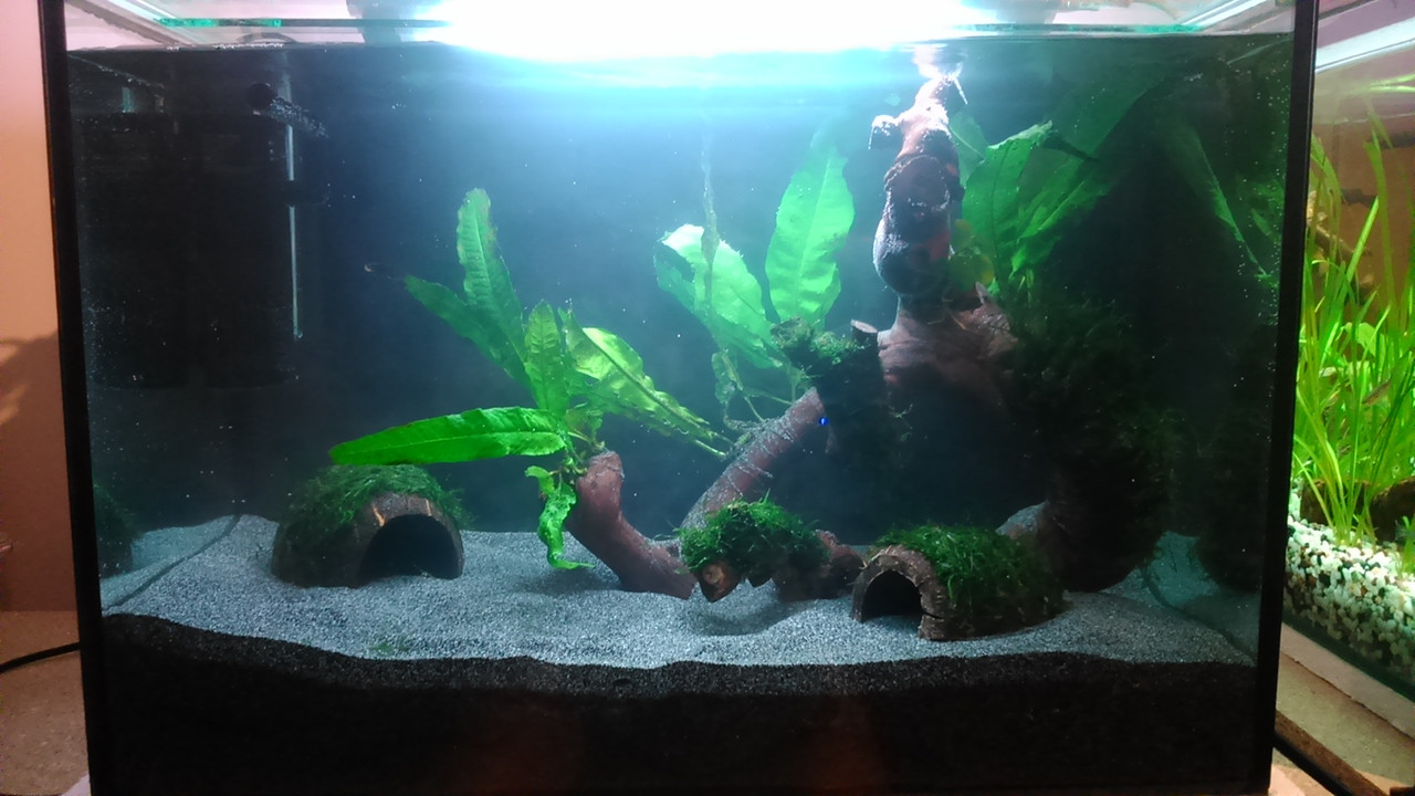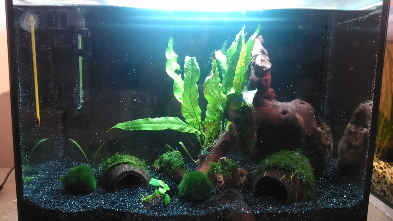 Растения:Само явански мъх, искам да добавя и кладофора и още нещо, което се прикрепя към камък или корен.
