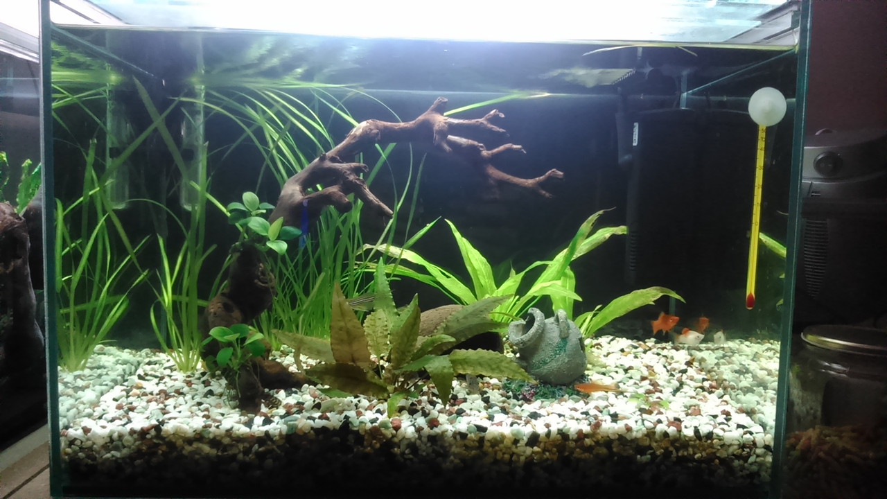 Доста промених нещата в аквариума има нови растения и 2 кладофори, които чакат да ги пусна в аквата. Надявам се да ви хареса и ако имате критики, казвайте. Между другото този грунд, винаги когато сменям вода всичко се размътва, за напред ще правя смените на водата по-бавно, ако не, купувам черен грунд 2-3 мм, събирам този който е в аквариума и ще го махна.