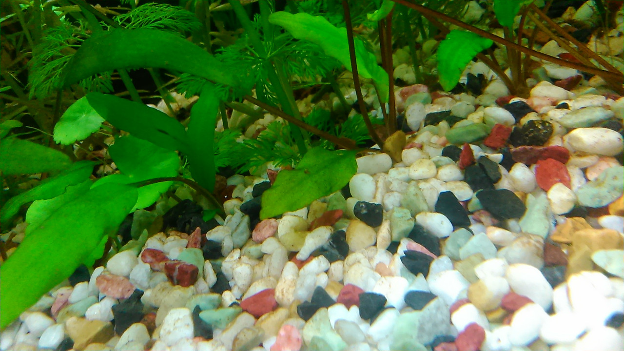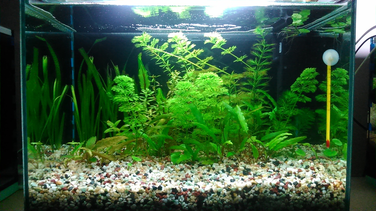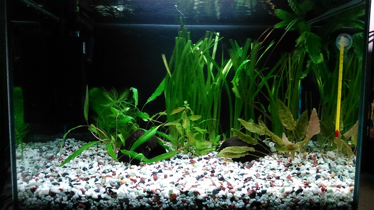 50 литровия аквариум претърпя доста промени докато ми хареса и най-накрая го докарах до някакъв вид.Последно когато сях китки,всичко бях изкоренил и остана грунд с около 20-30% вода. Сложих подхранващи таблетки "Dajana Plant Root" и се започна засаждането. В началото хванах доста видове водорасли, но за щастие се махнаха. Осветлението ми е 2х Т5 пури 8W 6500K, сякаш е слабо за 50 литра и си мислех да добавя още една, но вие кажете.Филтъра уж го дават 600L/H ама май не е така,много слаб, чистех го какво ли не го правих, не може да раздвижи достатъчно повърхността и имам ципа  :-(.Мислех си да го сменя с един на Hailea 200L/H, че като гледам как работи в 30 литровия, прави много по добро течение и там нямам ципа + че флейтата му е обърната към стъклото,за да не е прекалено силно течението.Та да се върна към 50 литровия, все още няма рибки там ( има някои друг охлюв ), та мислех си след 2-3 дни да вкарам всичките 8 рибки.Водата я сменям всяка неделя по 11 литра, чистя стъклата където е достъпно, сифонирам, чистя филтъра,растенията се развиват добре и си пускат нови листа, че даже някои ги кастрех.