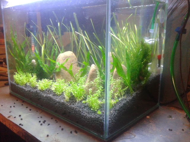 Сметнах поради по-малката инвестиция главно, да се захвана с нещо наистина малко ( първа грешка) , с идеята да бъде растителен . После се оказа , че ще става скаридарник  :-D  , а накрая реших и да пусна няколко рибета за цвят   :duvar: .