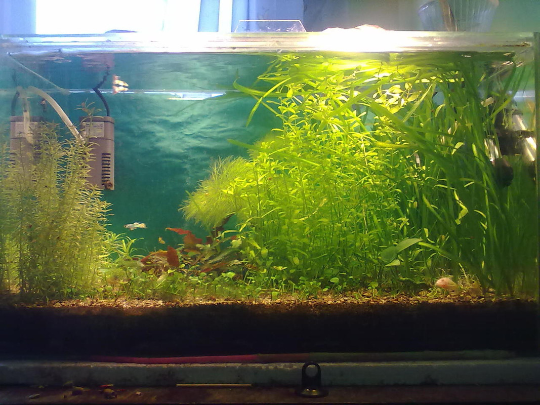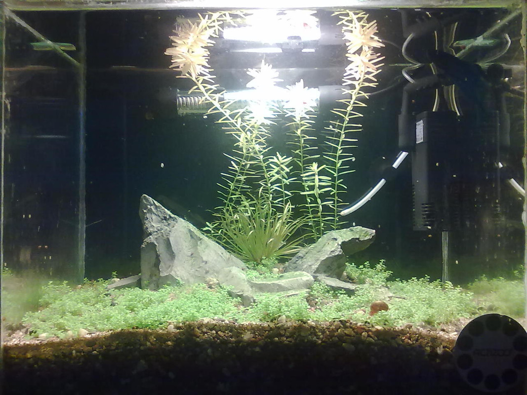 18-литровия го стартирах в събота с стар грунд и стара вода.Растенията са Хетерантера зостерифолия и Марсилея хирсута.Има десетина бебета гупи.Подавам Co2 и торя с тор от Деян. Филтрацията е един китайски вътрешен филтър 200л/ч.Осветлението е една енергоспестяваща крушка 14 вата.