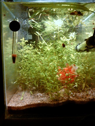 Нарочно не съм вадил филтъра, нагревателя и термометъра, за да видите кое къде съм сложил и да ме посъветвате кое къде да преместя. Искам да ви попитам къде и как да сложа филтъра, защото е 350 л. на час, а в аквариума има чисто към 25л. вода. И мисля, че е множко и рибите ги влачи течението яко. И се чудя какво да измисля за да не пречи на рибките, да не им прави голямо течение.
