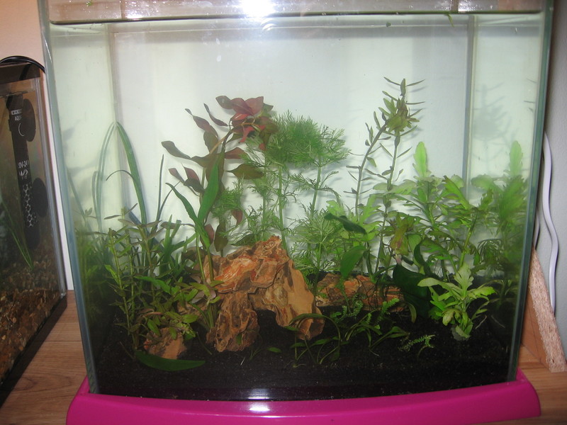 Добре де, признавам си..не се стърпях и  поразместих малкия аквариум. Не се заоблачи супер много водата.... Ей, сега  да не чета приказки от сорта " слагала където ти падне"  :-P 'щото много се старах  :-[