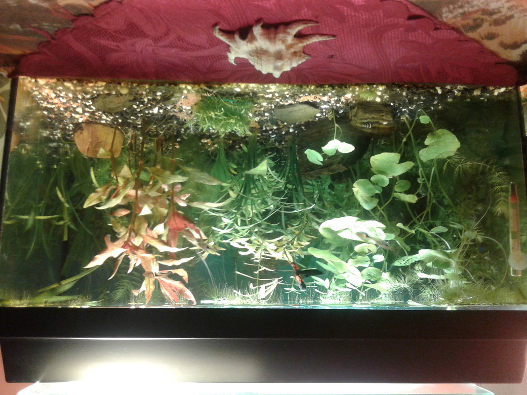 38л.Аквариум осветление 53 вата обикновена лампа. Торене proflor, CO2 vital.Обитатели 1 звезден анциструс, 1коридорас панда,  6 диви венецуелски гупи + рояк бебета и много охлюви хелена.Аквариума е стартиран преди две години.