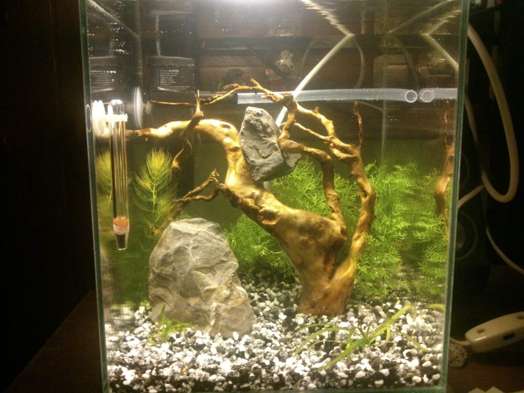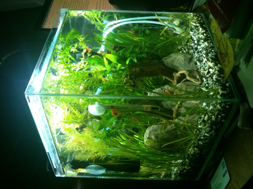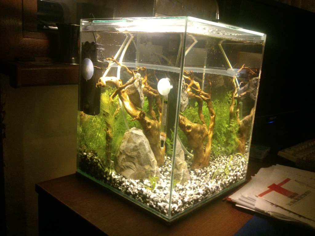 Колеги, днес спретнах едно нано 18 литра 25x25x30h, светя с енергоспестяваща 9w, филтърът е вътрешен Хаилеа бт200, нагревател нямам още, водата е 22c, растенията са от голямата аква - папрат, роголистник и валиснерия. Водата е 3/4 от големия аквариум. Какви обитатели да му пусна, мисля си за неонки 4 на брой