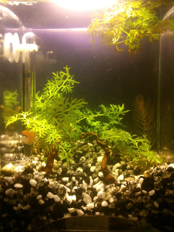 Пуснах и една ваза около 2 литра, само прашасваше вкъщи и реших да я напълня, пуснах и лампа 8w енергоспест., малко папрат и роголистник от големия и 2 планорбиса