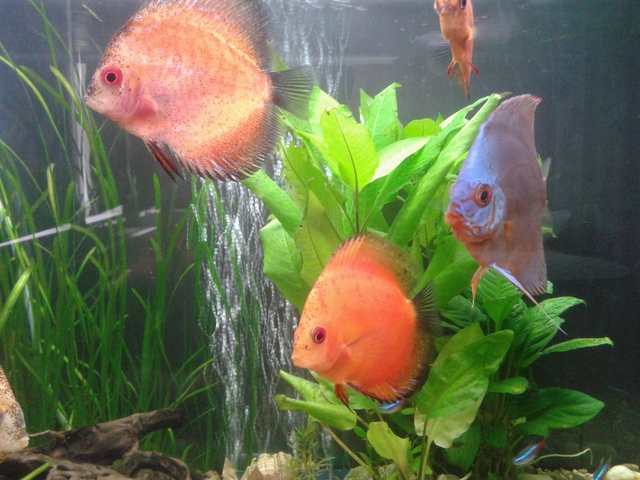 За сега се чувстват доста добре. Освен това ми се струват доста преекспонирани тезите за отглеждане на дискуси при положение,че абосолютно всички развъдчици отглеждат дискусите по начини противоположни на тея които са описани за оптимални само и само за да израстнат бързо големи и да ги продадат за повече пари. хранят ги с тубифекс и други такива храни които са противопоказни. После се изказват колко вредно било да хапват жива храна и замразена и не знам си какво, а те точно с това ги хранят. И освен това ги гледат в малки аквариуми по 100000000 риби.