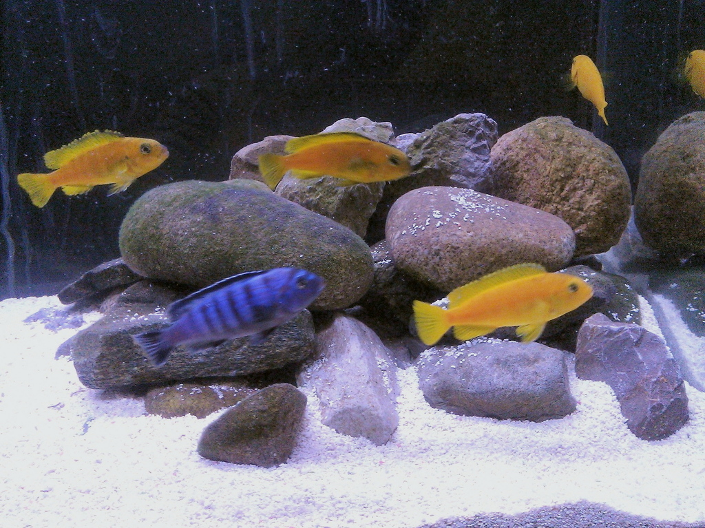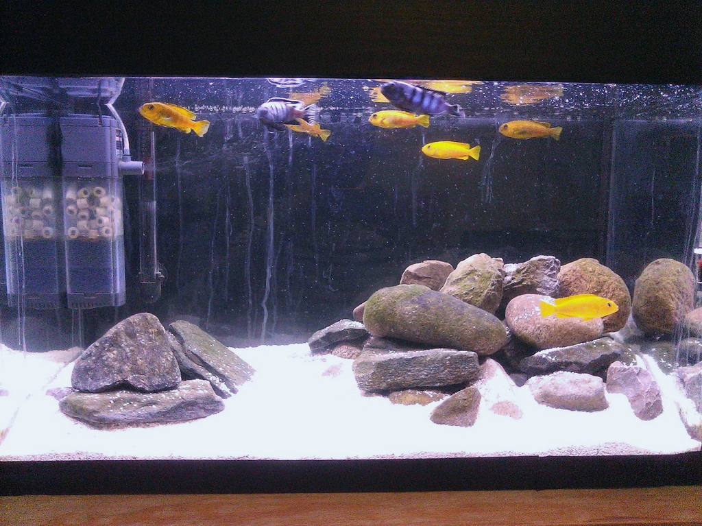 Хубав цихлидарник може би му липсват няколко по големи камъка за акцент ,а следите от засънала вода която се е стичала по стъклото развалят снимката   :-)