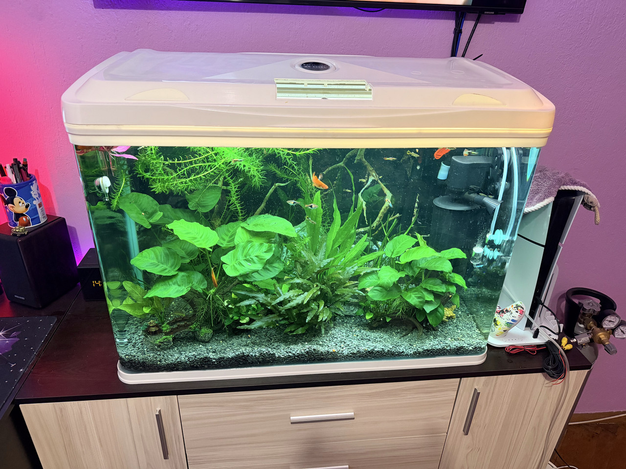 Честита нова година! След доста време отсъствие по ред причини, да се отчета и аз с развитието до сега на моя аквариум. В това време се убедих, че въглерода наистина върши чудеса. Поне за сега всичко върви почти перфектно, налучках баланса. Единствено Валиснерията така и не иска да се развива и стои на едно положение, което ме учудва, защото при предишни години, без co2 тя вървеше като луда. Ще я подменя с криптокорина най-вероятно, която върви добре. Чумата върви също добре, но най-добре й е плуваща. Останових, че на дълбоко светлината не е достатъчна.