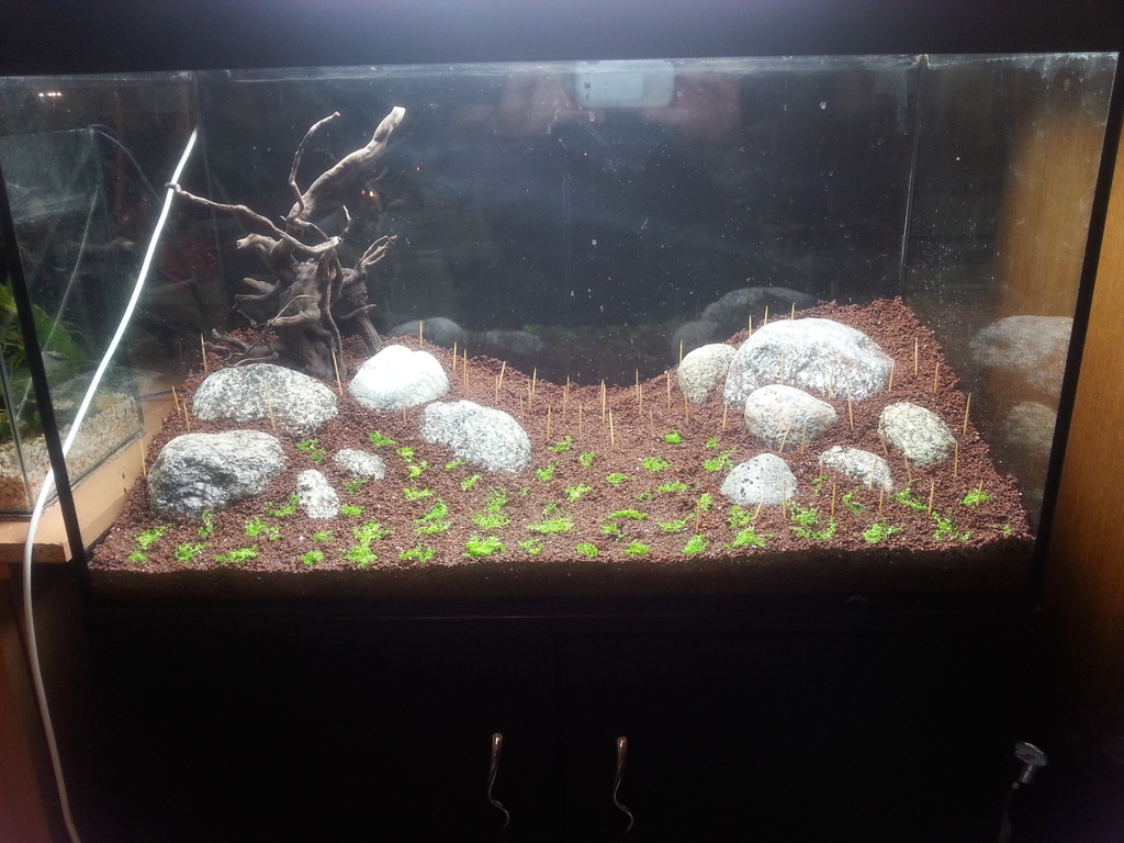 Те на снимката изглеждат по-закопани от колкото в действителност са. Не знам защо така се получава, ама при гледката на живо и при снимките, има балкан разлика. Но ще ги издърпам малко нагоре, само да тръгне кубата. Че сега не искам да бутам много, грунда още не е накиснат като хората (въпреки че стоя 2 седмици в леген с вода предварително), и най-малкото движение на водата и започват да се разнасят частици от манадото и да не вземе да се разхвърчи и кубата :)