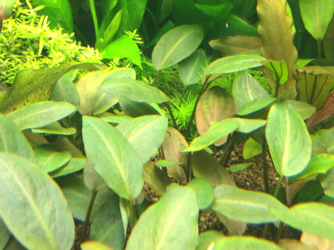В новия аквариум 1 следмица след залесяване вече ехинодорусите преминават от надводна в подводна форма... красивите розови листа на Echinodorus Red Diamond правят впечетление.