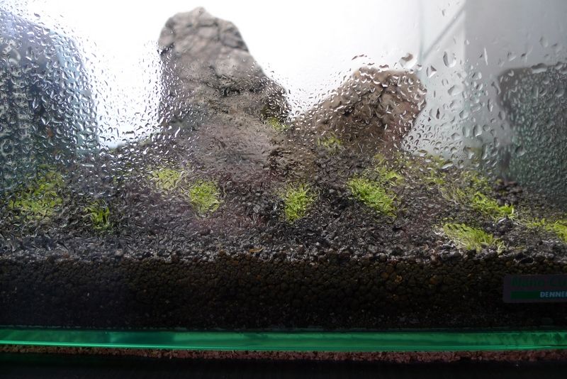 Много сериозни камъни! Сега ако си уплътнил аквариума хубаво - газ на осветлението по 12 часа на денонощие, без страх от водорасли! Това наистина е голям кеф! Можеш да го оставиш и слънце да го огрява допълнително, нищо му няма, поне при мен беше така. Водата гледай да е толкова, че да не се подава от грунда, в най-ниската му част. Всеки ден може да дърпаш от нея същата и да пръскаш, може и малко тор да добавиш в нея. Може и част от нея да сменяш от време на време ако не те мързи. Все пак е добре водата да не е твърда.