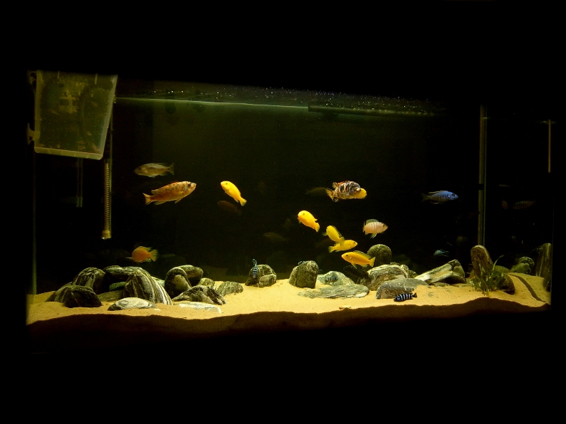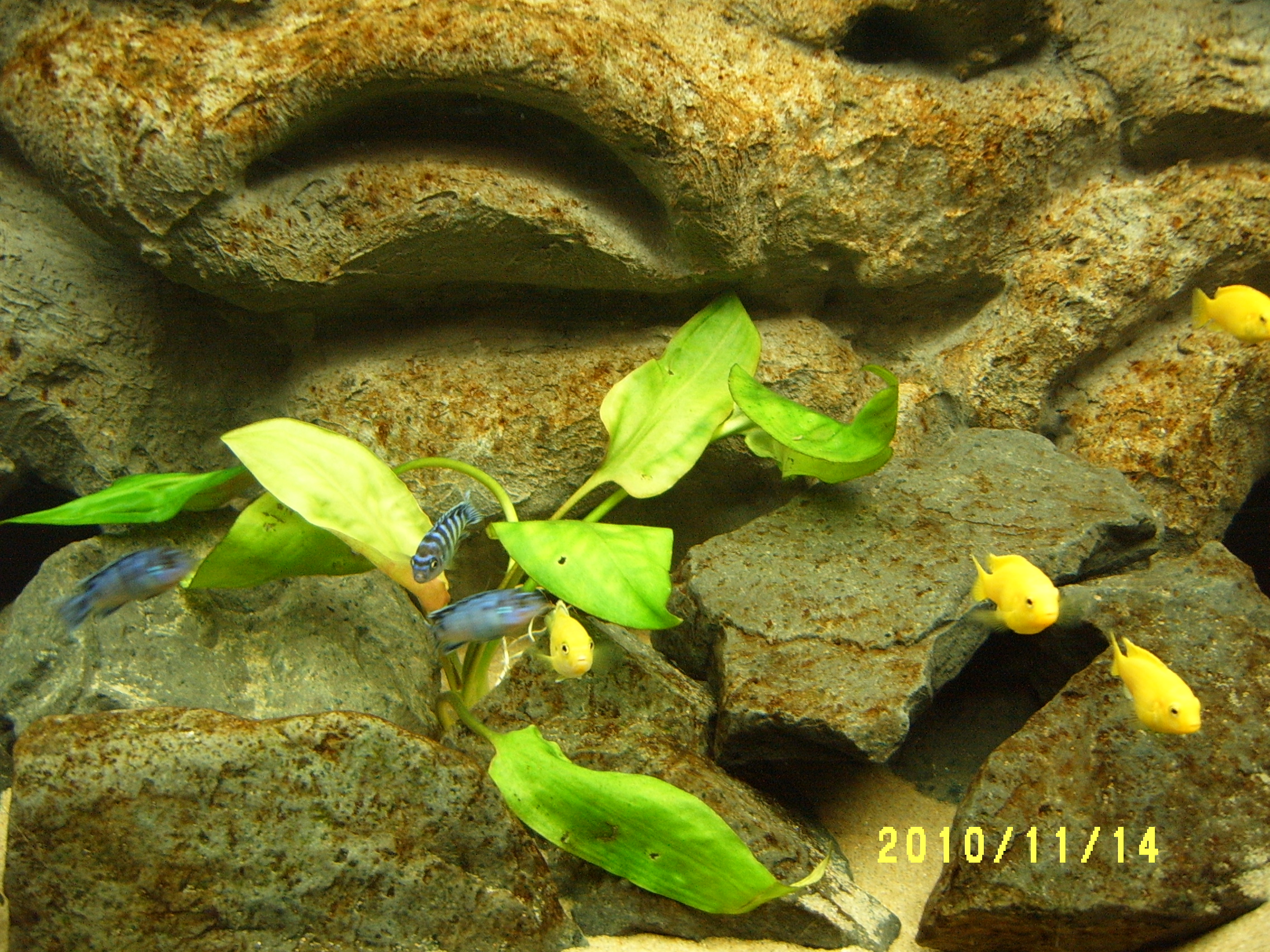 За укритията бъркаш, под двете купчини камъни лявата и дясната всичко е изровено и няма грам песъчинка, вижда се подложката :) Териториите са разпределени и за това няма и агресия. Половината камъни са зарити, тези риби не търпят много аранжировка, сами си преаранжират аквариума, затова и растенията са на такива места, на които не ровят.